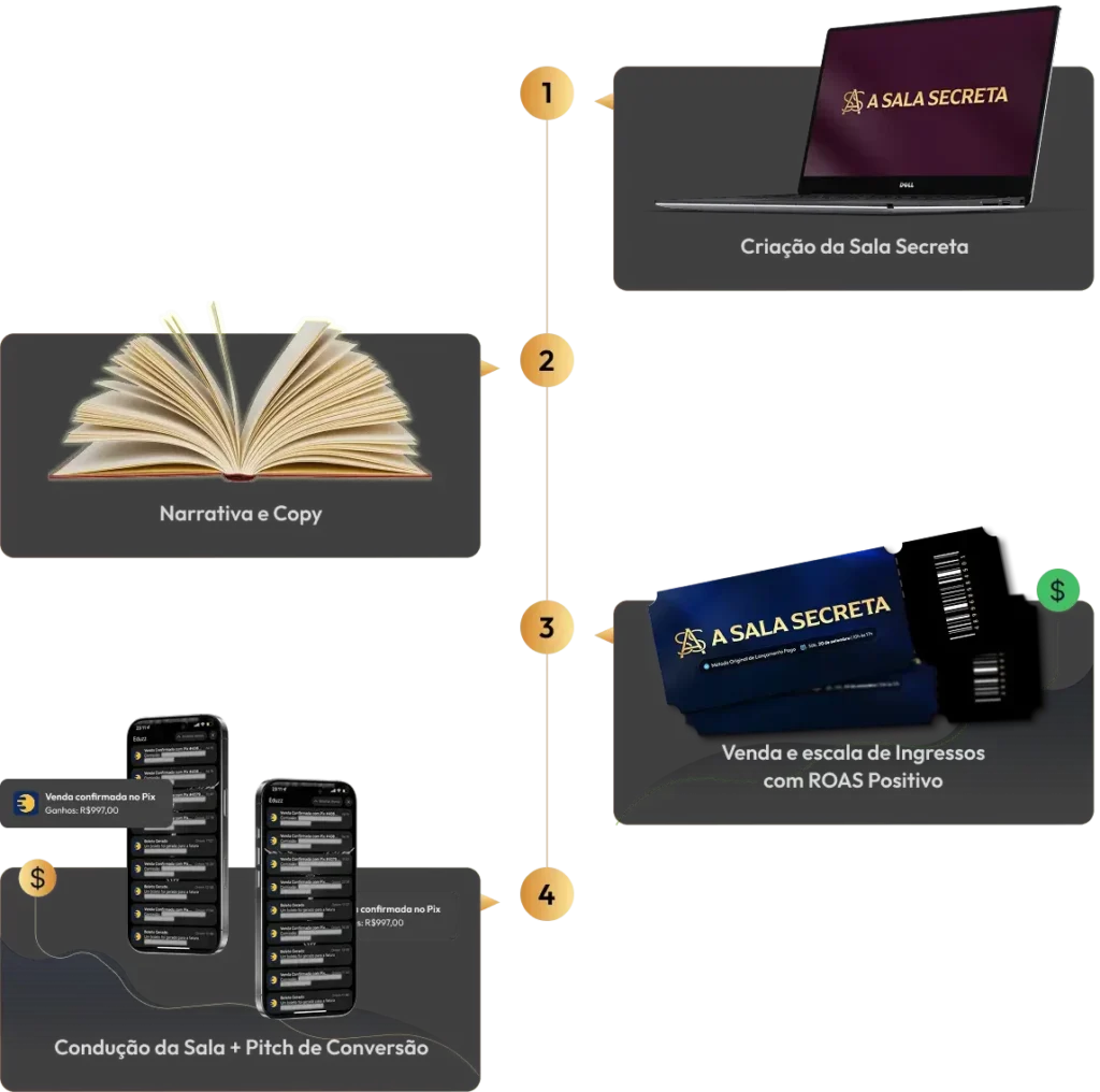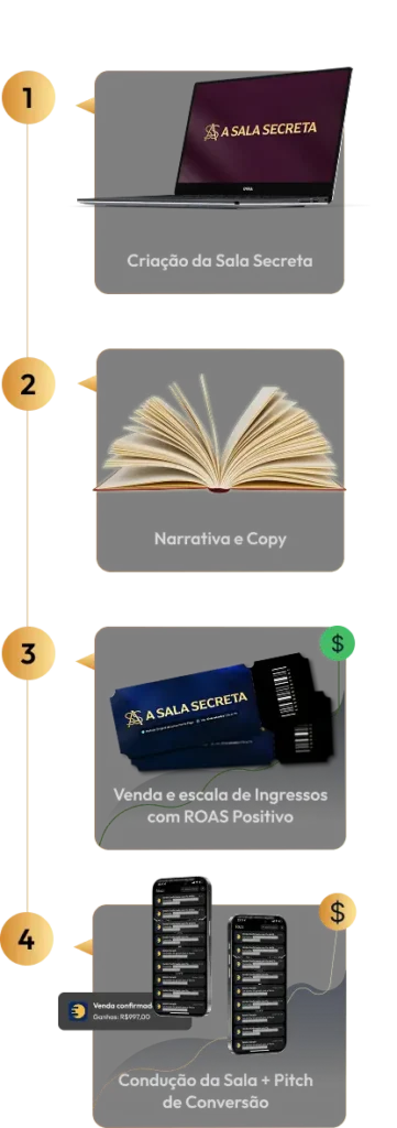 A Sala Secreta é um evento fechado no Zoom, 100% focado em ensinar, passo a passo, como construir, estruturar e escalar um lançamento pago com lucro e previsibilidade desde o primeiro anúncio.